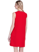 The Gigi Dress features a red neck shift design with an embellished collar lined with sparkling rhinestones. Its streamlined silhouette offers a flattering fit that is perfect for a variety of occasions. This dress combines classic style with eye-catching detail for a polished, sophisticated look.