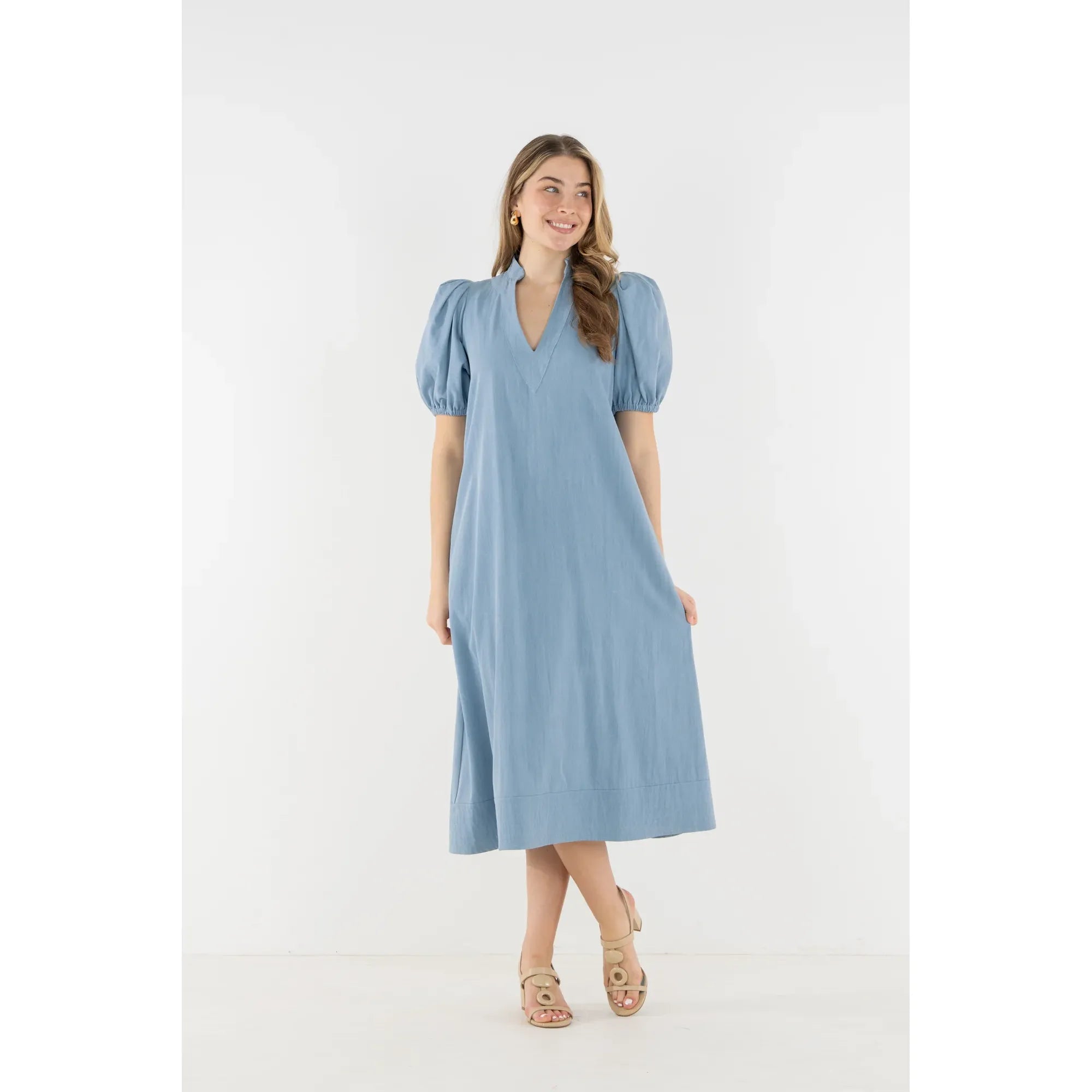 The Hampton Dress in Denim Chambray is an effortless, seasonless silhouette designed for everyday wear. It features a mandarin-style collar with a clean v-neckline, elastic puff sleeves, and a loose-fitting shape that offers ease and comfort throughout the day. Finished with functional side pockets, this elevated basic balances practicality with timeless design in a lightweight chambray fabrication.
