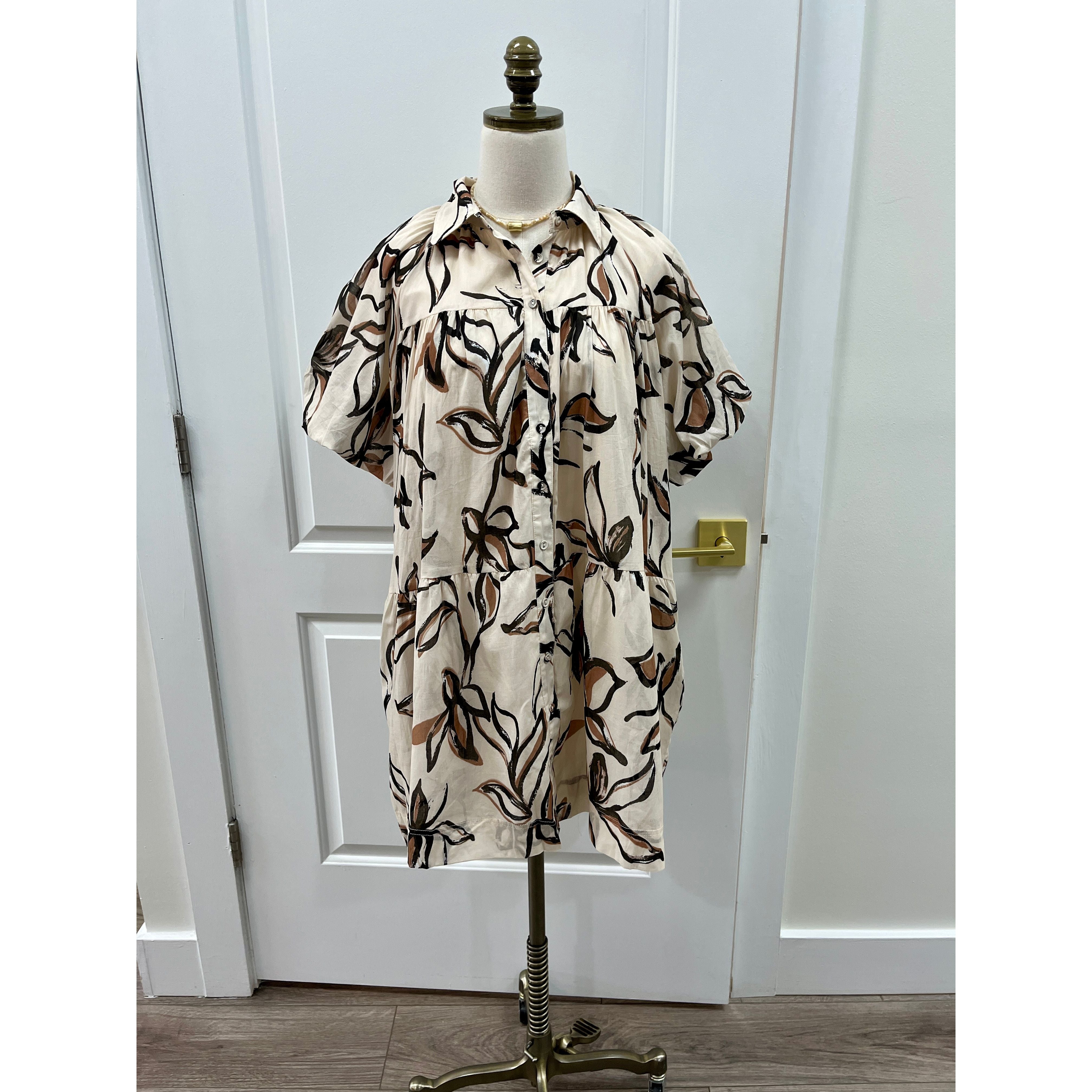 The Sienna Floral Shirt Dress features a lightweight fabric with an abstract leaf-inspired print in warm earthy tones on a neutral background. It offers a button-front design, collared neckline, and short puff sleeves, creating a relaxed tiered silhouette. Versatile and comfortable, this dress pairs effortlessly with sandals, sneakers, or boots, making it ideal for various events.