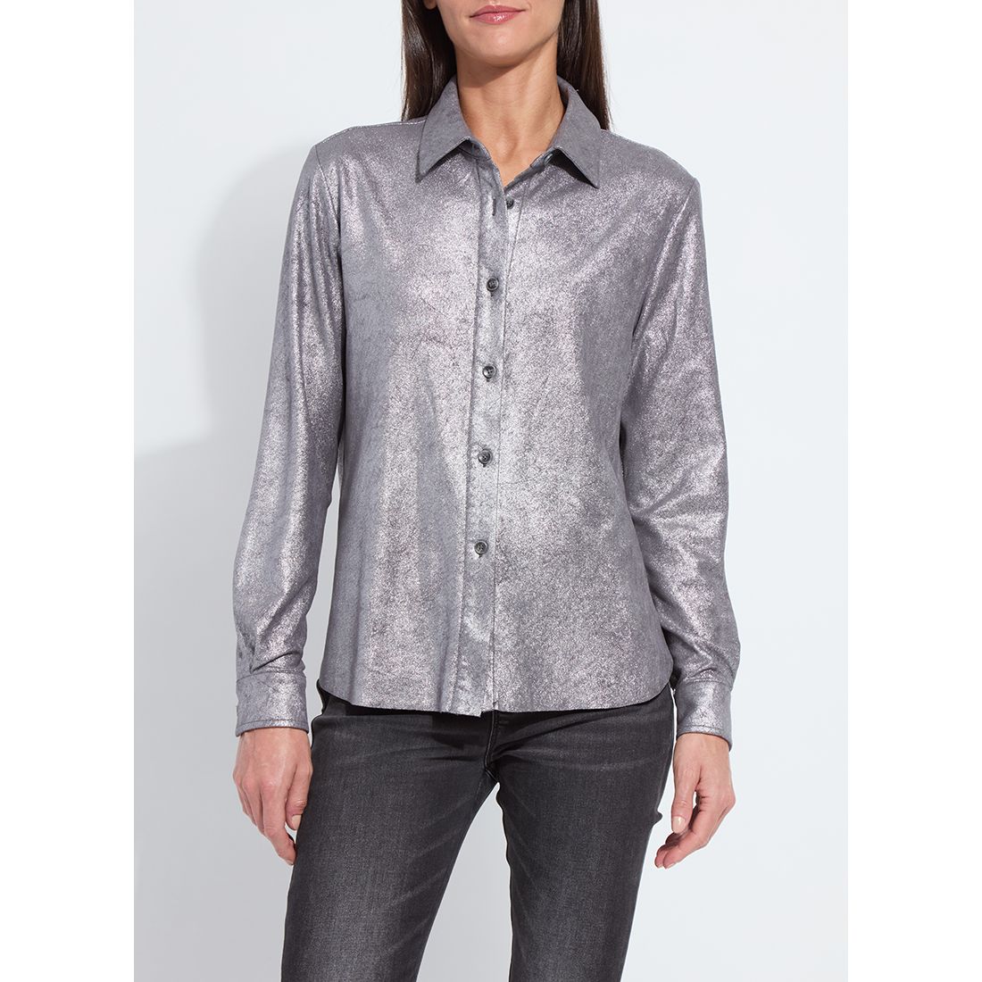 The Connie Suede Shacket features a patent foil finish on vegan suede, offering a modern twist on classic outerwear. Its structured design provides a stylish layer perfect for transitional weather, combining durability with a distinctive metallic sheen. Ideal for those seeking a standout piece that blends contemporary materials with a timeless silhouette.