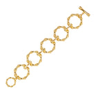 A perfect match for other bamboo jewelry, this bracelet can dress up an outfit, or be worn casually. It has the ability to do both with the shimmering gold and detailed links. It is 7 & 1/2" in length and 1 & 1/8" in width. It features a toggle closure