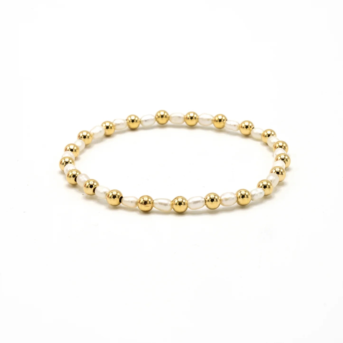 This stretch bracelet features 14k gold-filled beads paired with freshwater pearls, designed for effortless wear alone or layered with others.