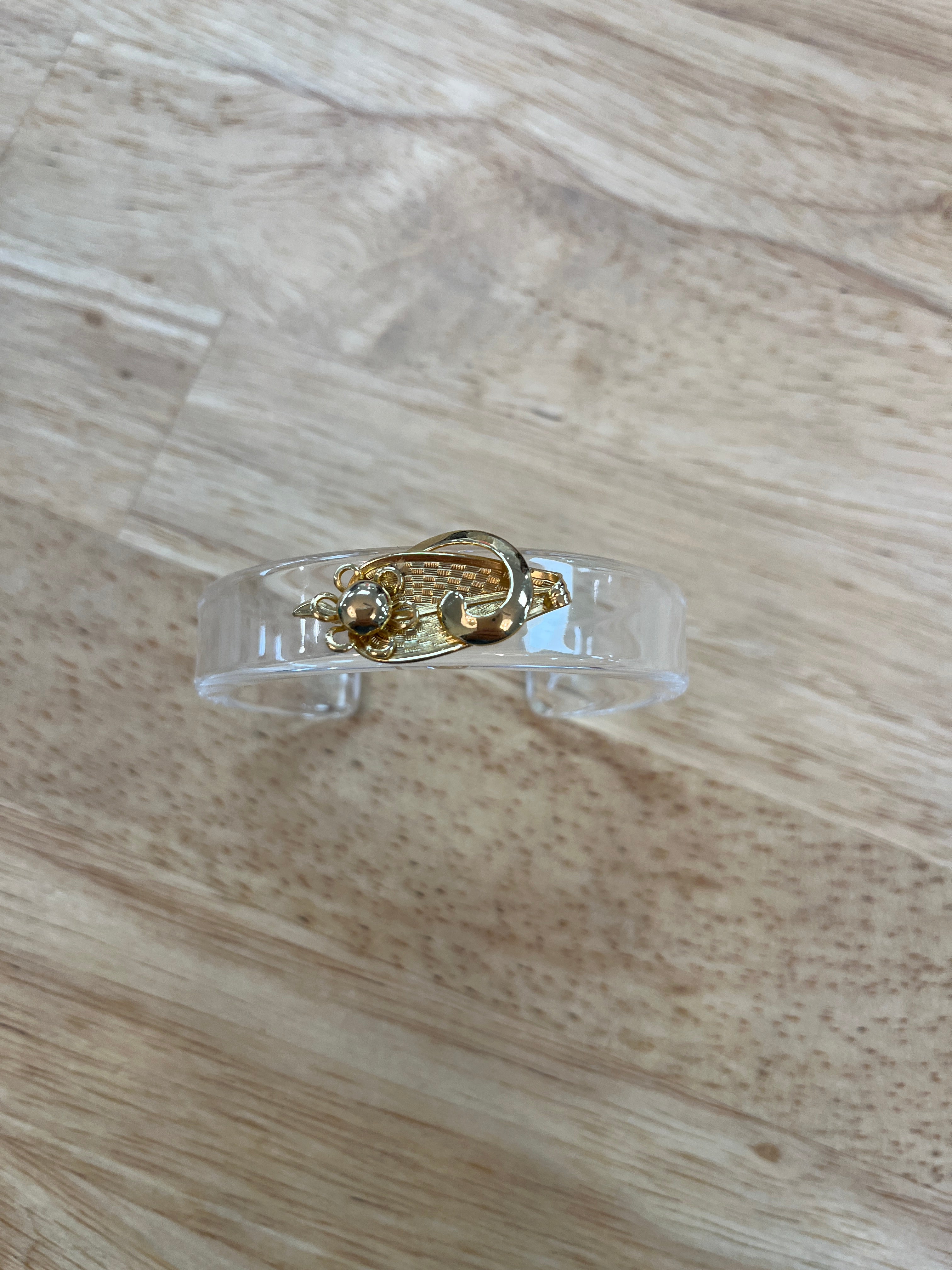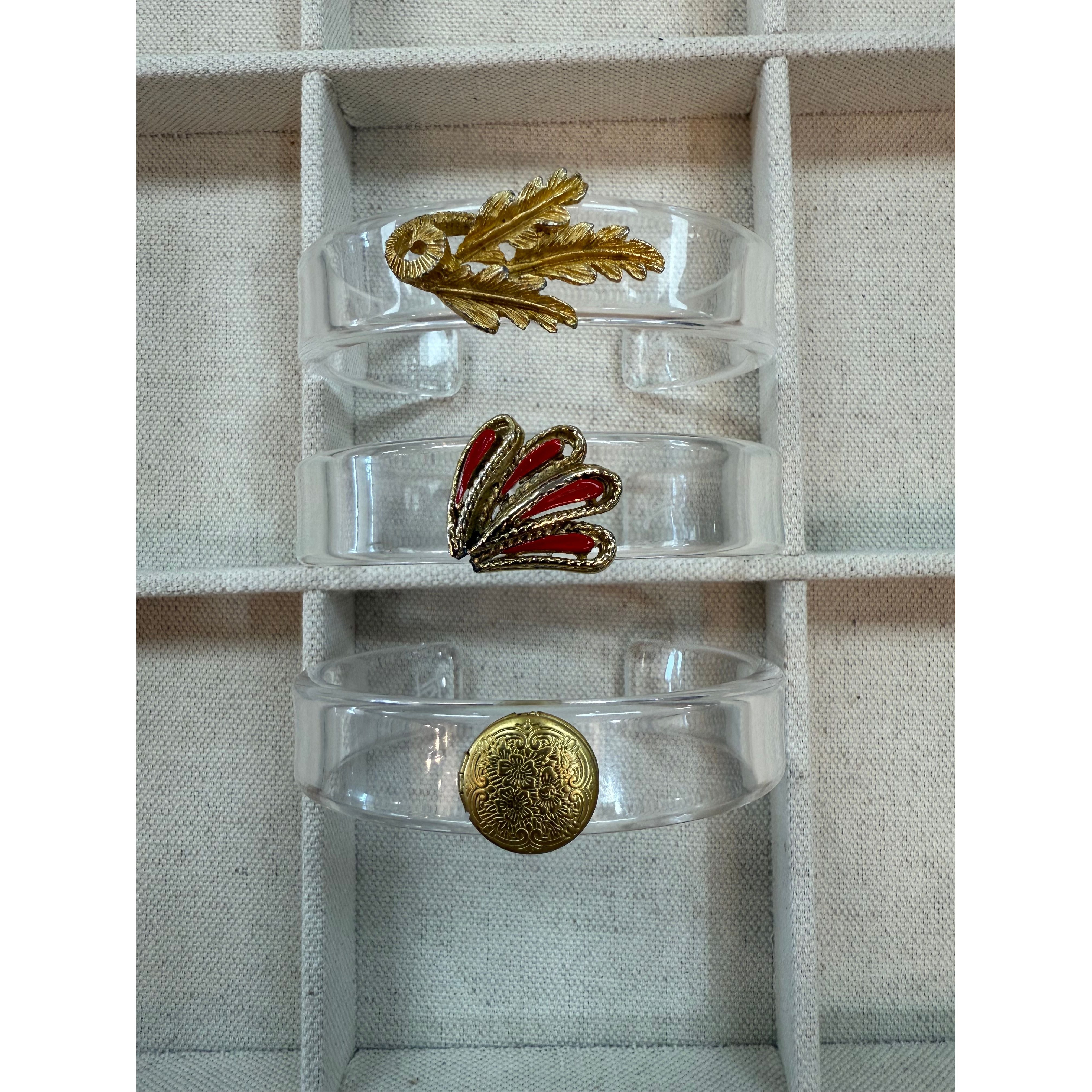These acrylic cuffs from JT Vintage are handmade, using vintage gems like brooches, lockets, clip on earrings, cuff links, and pendants. Each gem is attached with waterproof epoxy/resin glue to an acrylic piece. These narrow acrylic cuffs are one size fits most.