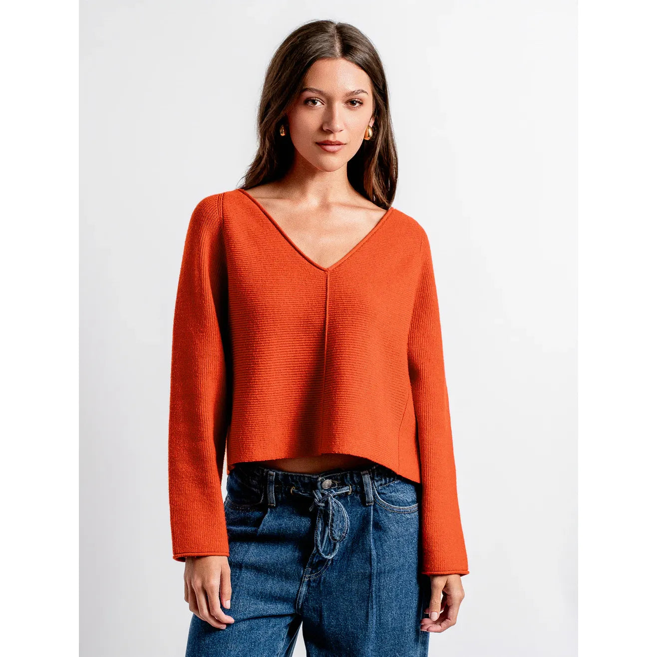 This Asima V-neck Top in coral features long raglan sleeves for a flattering fit and center front piping that adds a subtle design detail. Finished with roll hem accents, it offers a polished look that’s great for both casual and dressier occasions.