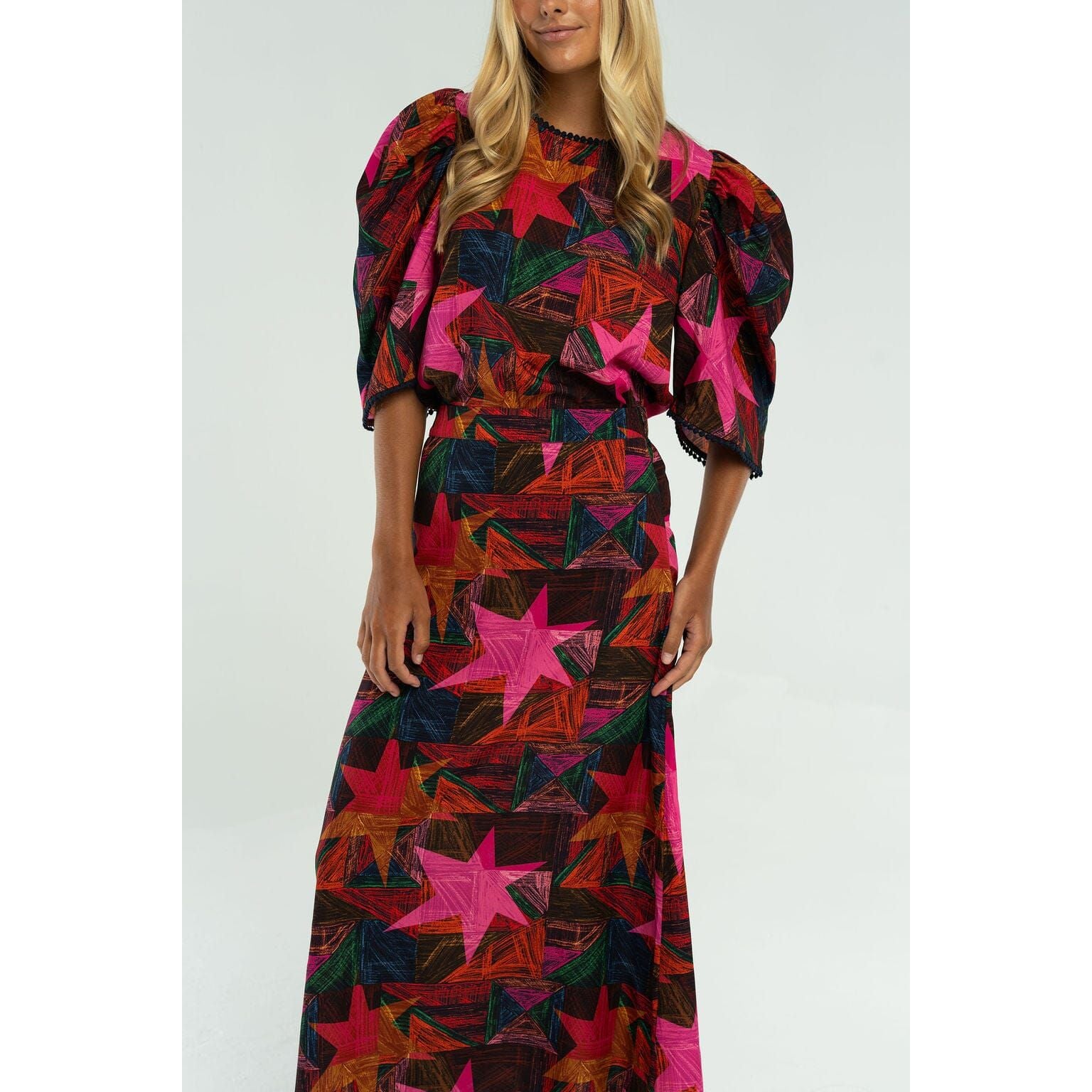 The Isla Blouse is a statement piece with bold charm and modern flair. Featuring a striking multicolor star print in shades of pink, orange, and green, this top showcases dramatic puff sleeves and a relaxed, blouson silhouette. Effortlessly chic, it pairs beautifully with high-waisted skirts or pants for a look that’s vibrant, confident, and full of personality.