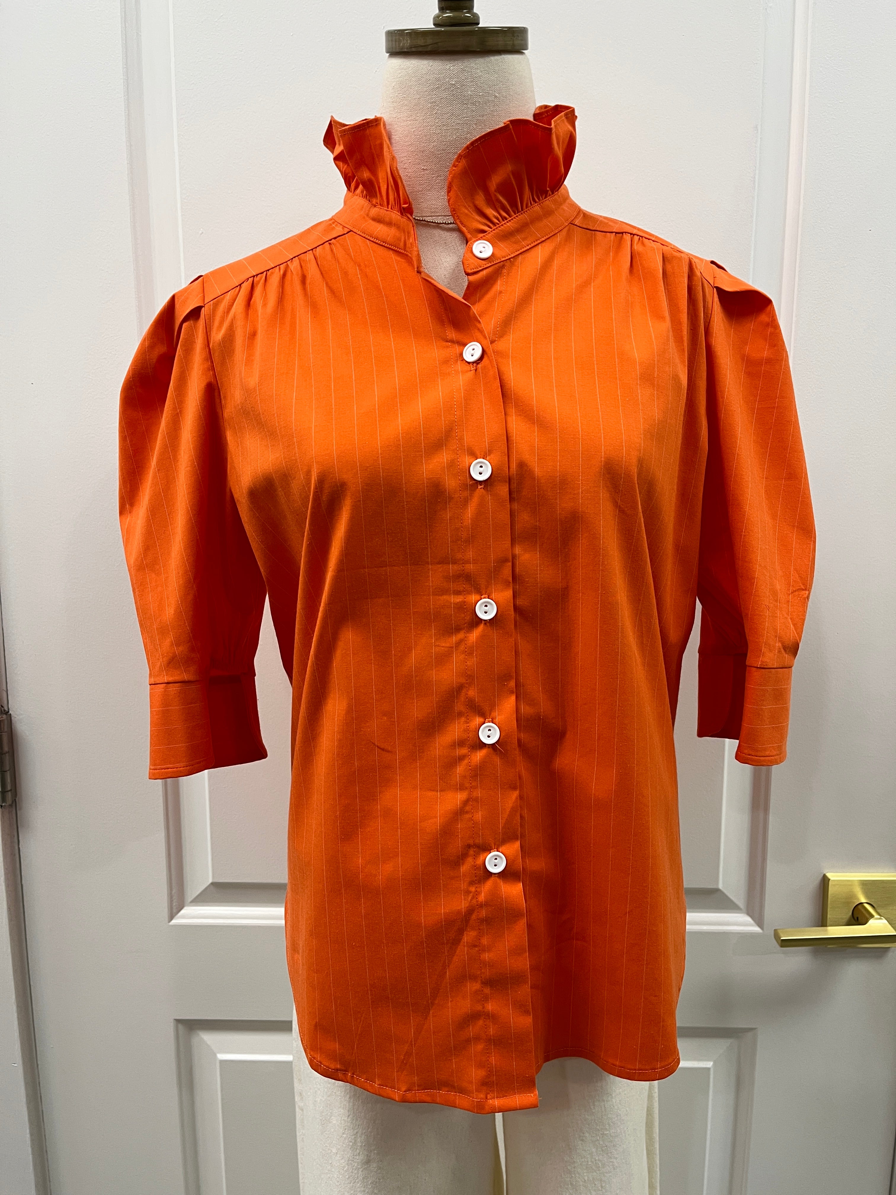 Orange pin stripe top with banded short sleeves and high ruffle neck.