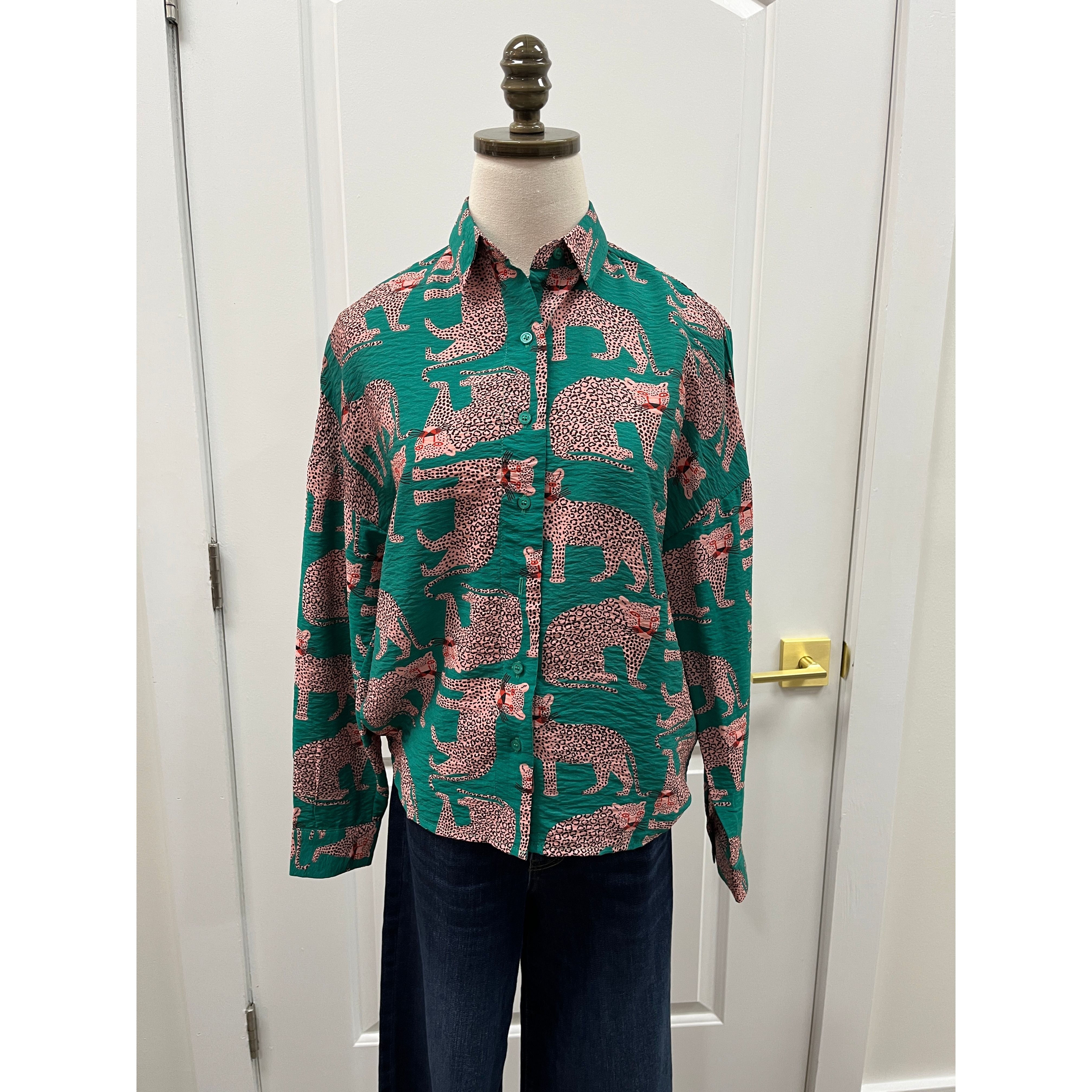 We love this green button front top! Featuring pink leopards and a slightly oversized fit it is the fun top of the season!