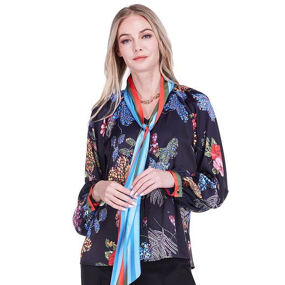This satin floral blouse features a striking mix of bold blooms on a sleek black background. Finished with a colorful striped neck tie and elegant button details, it's the perfect statement piece.