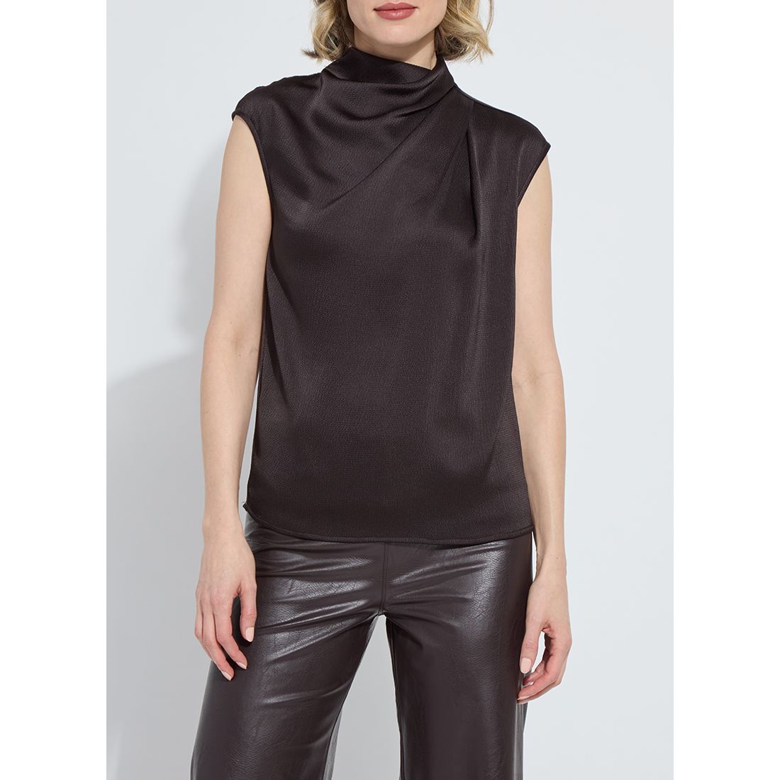 The Aisha Blouse in black features a sophisticated high neck and a draped silhouette that flatters any figure. Designed with a keyhole button closure at the back, this blouse combines elegance and subtle detailing for a polished look suitable for both professional and casual settings.