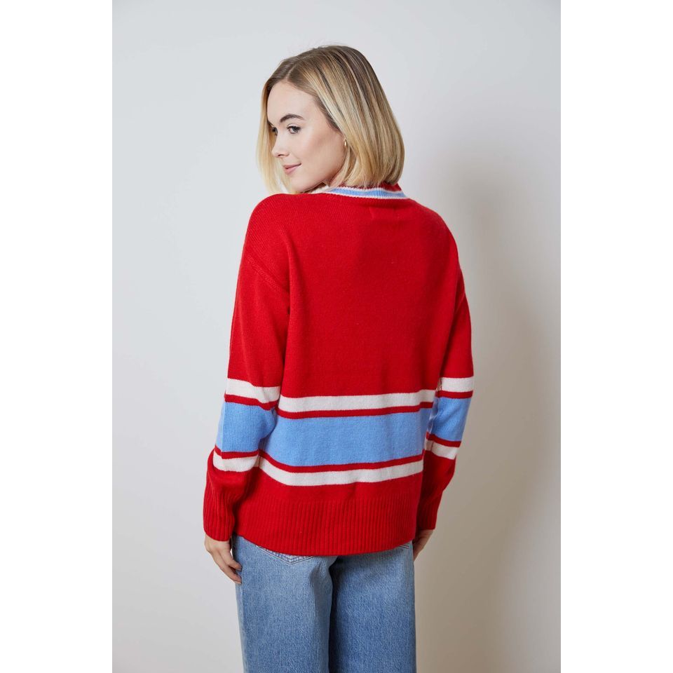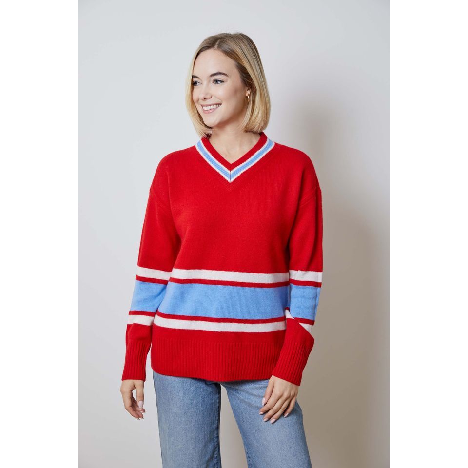 The Claire Sweater showcases a striking rugby postbox design in red and blue, made from pure cashmere for superior softness and warmth. This sweater provides comfortable wear and adds a vibrant touch to your cold-weather collection.