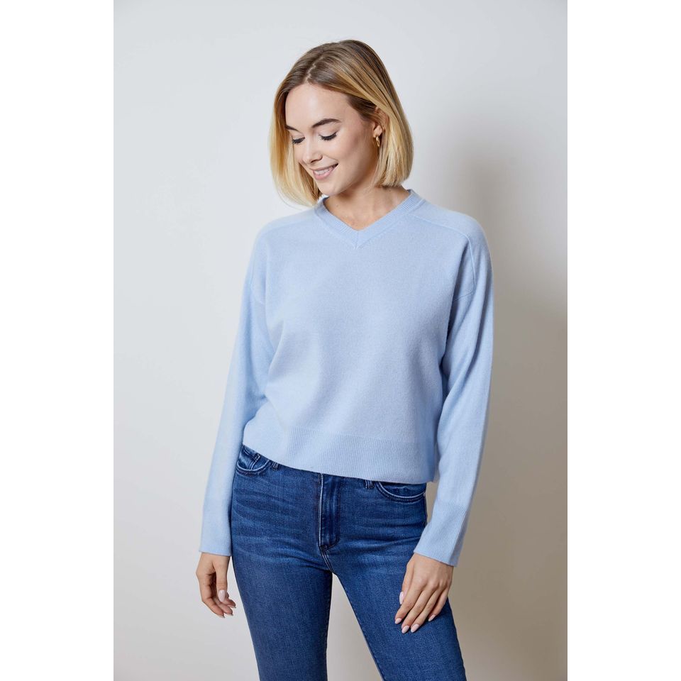 The Kelly Ruth Sweater features a high V-neck and is crafted from 100% light blue cashmere for a luxurious feel. Its simple, classic design is complemented by ribbed cuffs and a ribbed hem that provide a clean, polished finish. Perfect for layering or standalone wear, this sweater offers both elegance and comfort.