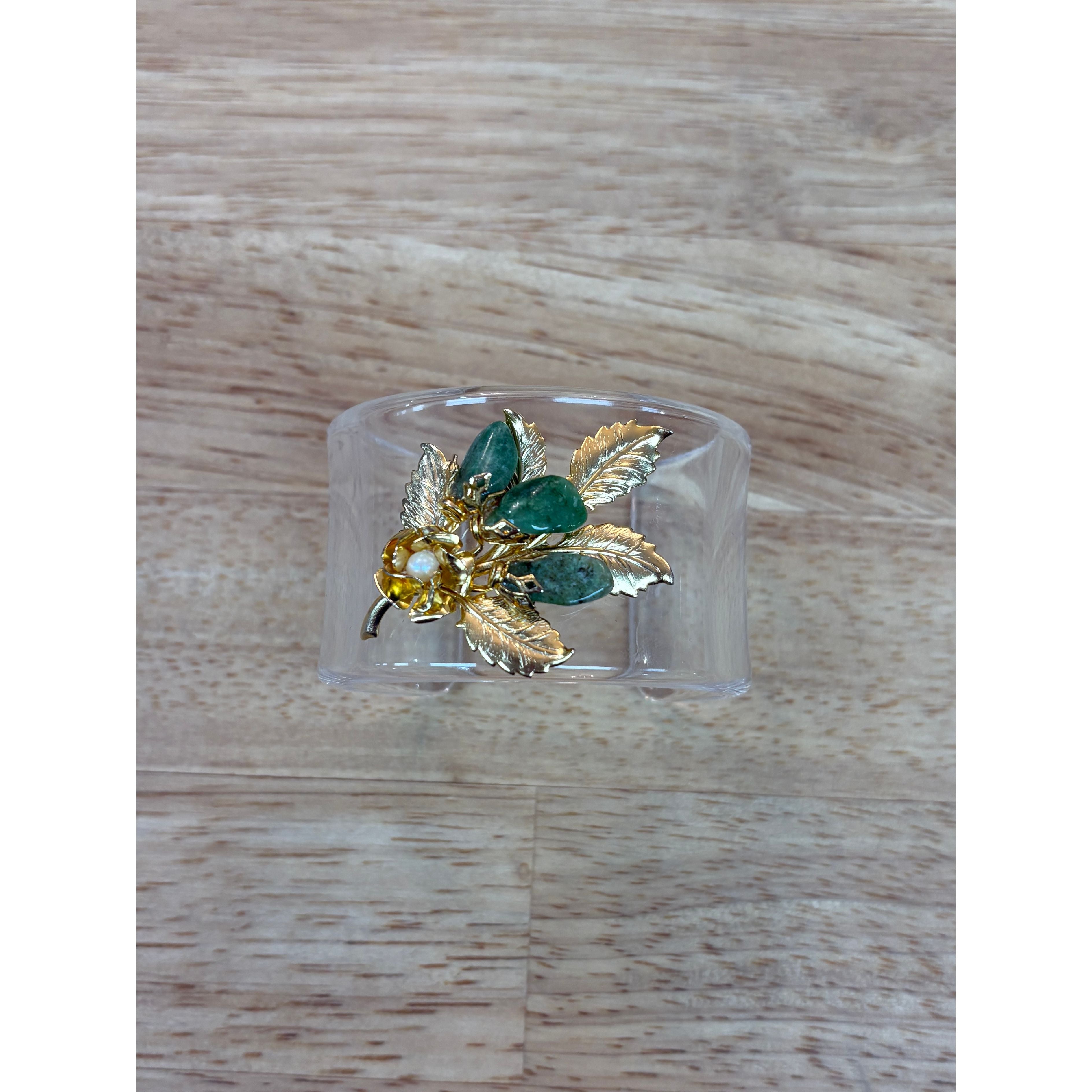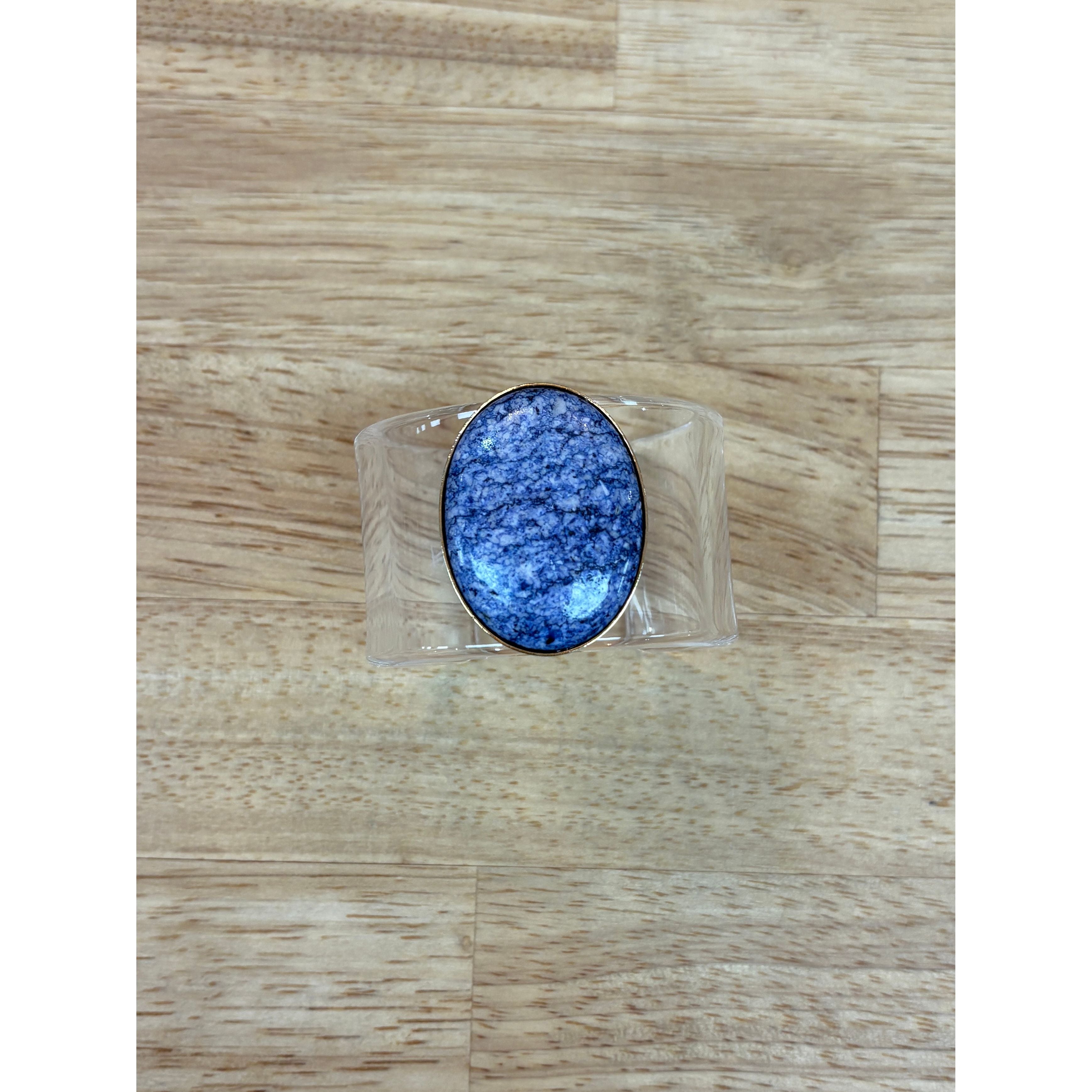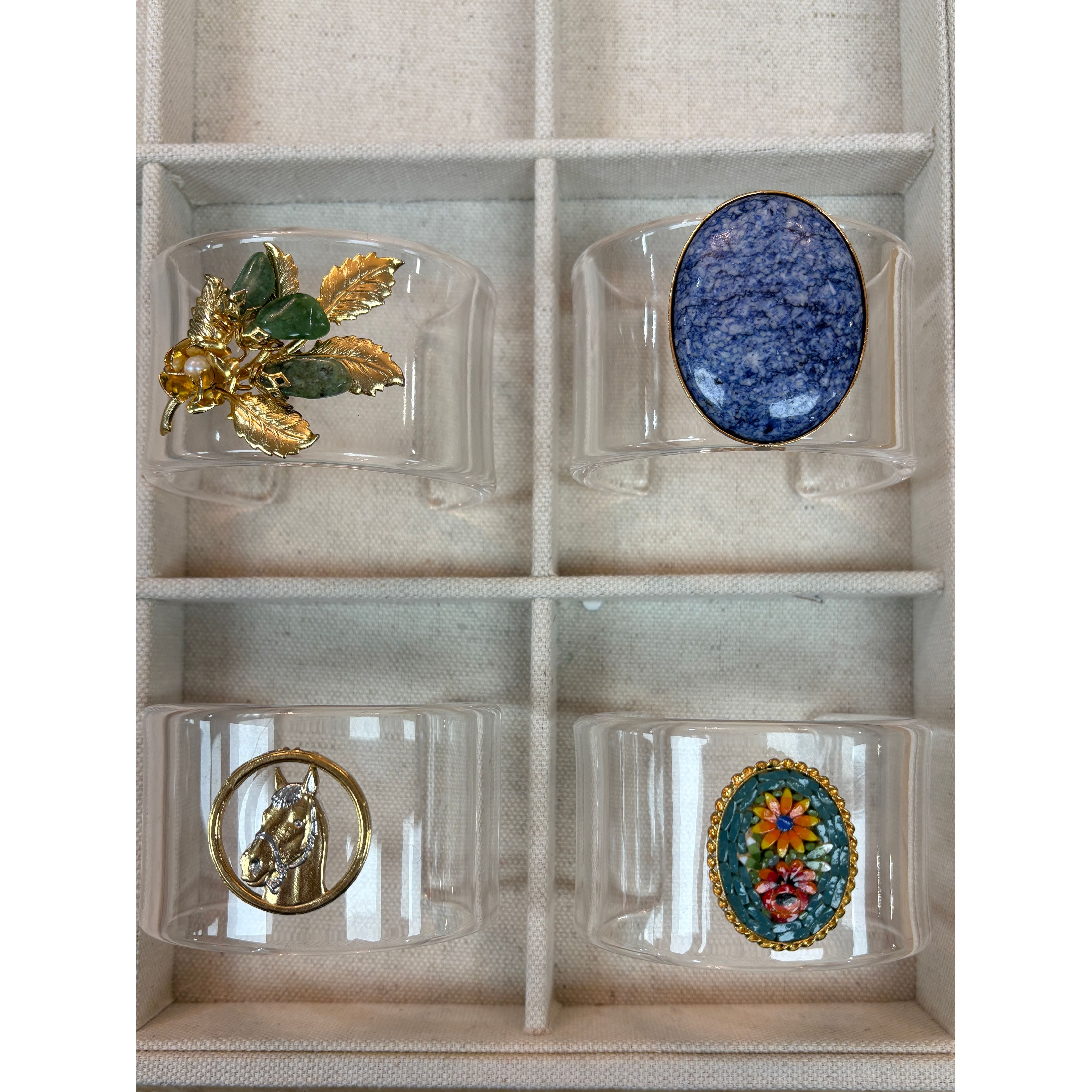These acrylic cuffs from JT Vintage are handmade, using vintage gems like brooches, lockets, clip on earrings, cuff links, and pendants. Each gem is attached with waterproof epoxy/resin glue to an acrylic piece. These fit a smaller wrist.